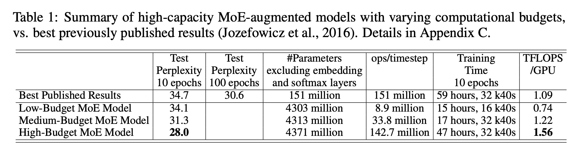 本文中基于LSTM堆栈基础上应用了MOE结果使得参数量提升至137B大小,